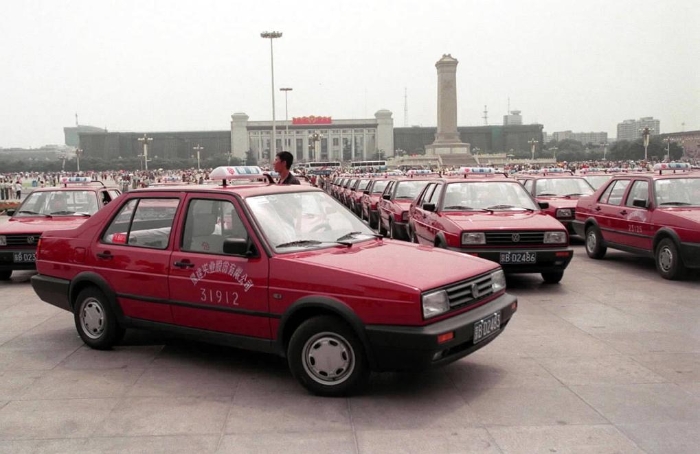 ▲2000年7月9日,北京五大出租车公司订购3000辆一汽-大众捷达轿车签字仪式在北京举行。这是仪式后,首批300辆捷达驶向北京街头。