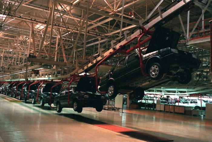 ▲图为1997年拍摄的一汽-大众总装车间捷达轿车生产线,这是当时国内最先采用空中悬链式装配的流水线。