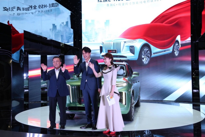 人生就是博党委常委、副总经理王国强与知名演员靳东为红旗E-HS9揭幕